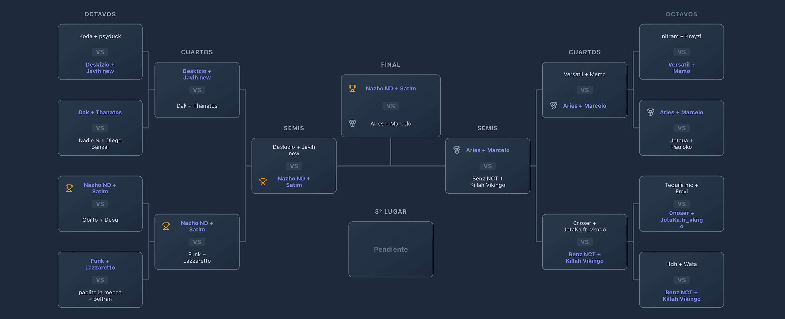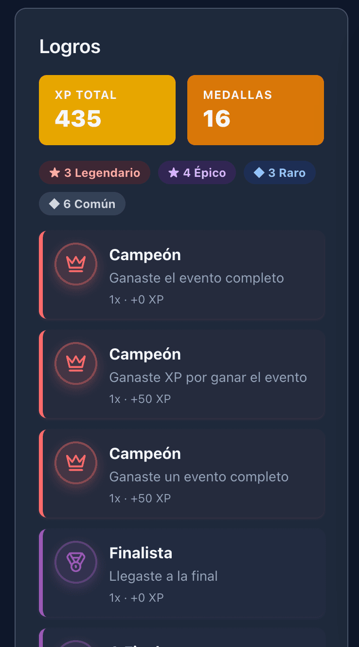 Crea eventos, abre inscripciones, arma llaves, vota, publica resultados y construye historial desde un mismo sistema.