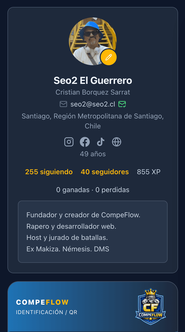 20 años en la escena del freestyle. Host y jurado en eventos internacionales. Tuvo la visión de CompeFlow y lidera el desarrollo técnico de la plataforma.