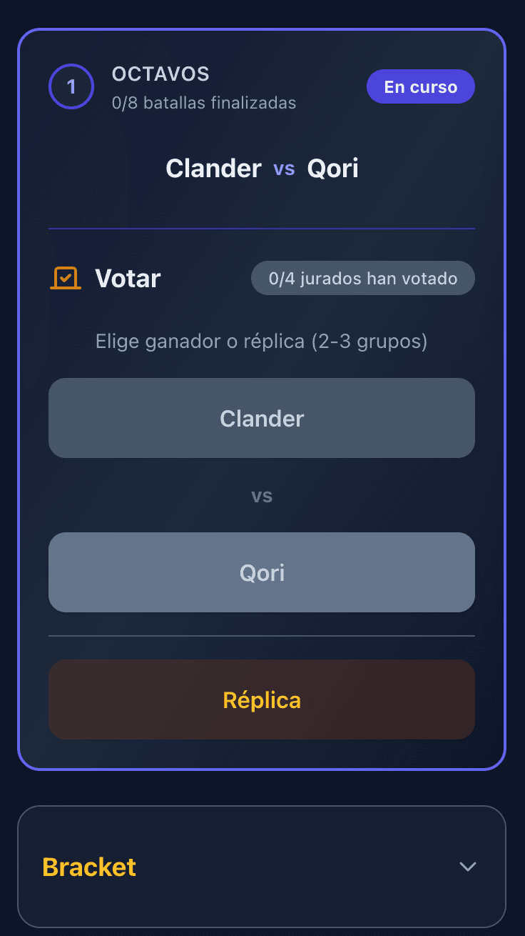 Votas, acompañas el desarrollo del evento y dejas trazabilidad en cada batalla.