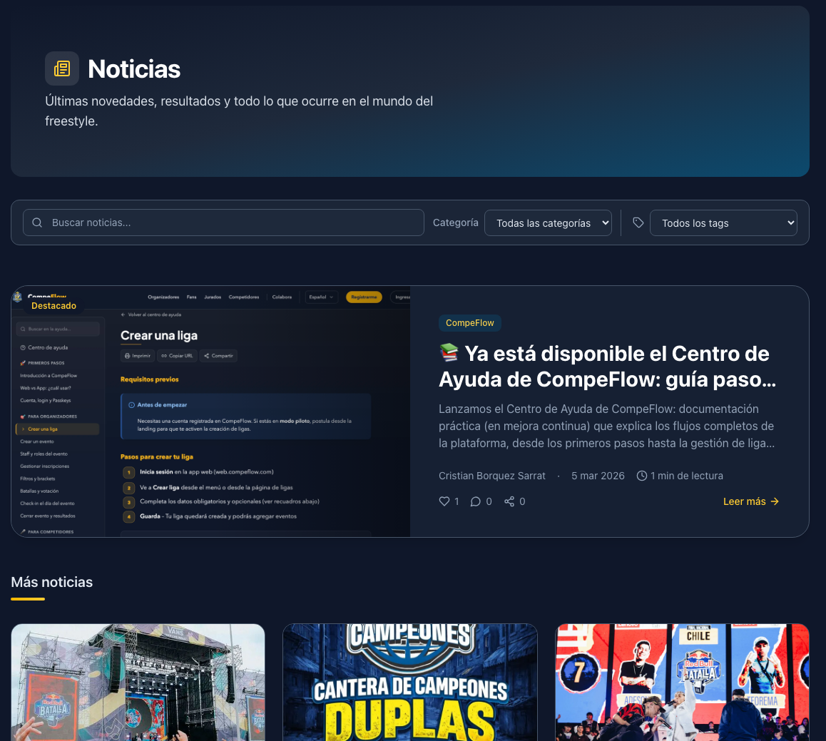 Noticias permite explorar contenido editorial, filtrar y guardar publicaciones para revisar después.