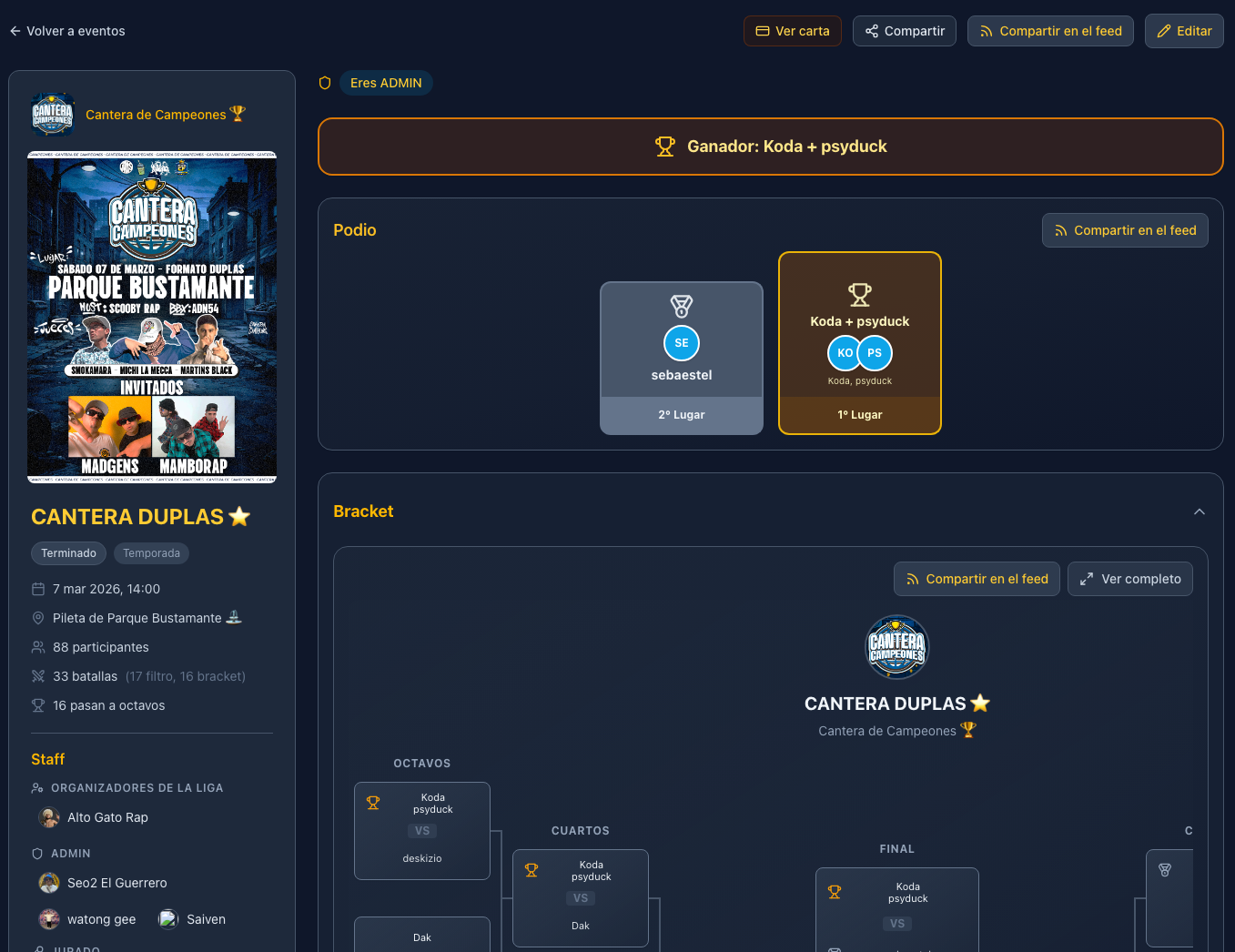 - El podio se muestra públicamente: 3 posiciones (1°, 2°, 3°) si se jugó la batalla por el tercer lugar, o 2 posiciones (1°, 2°) si se saltó