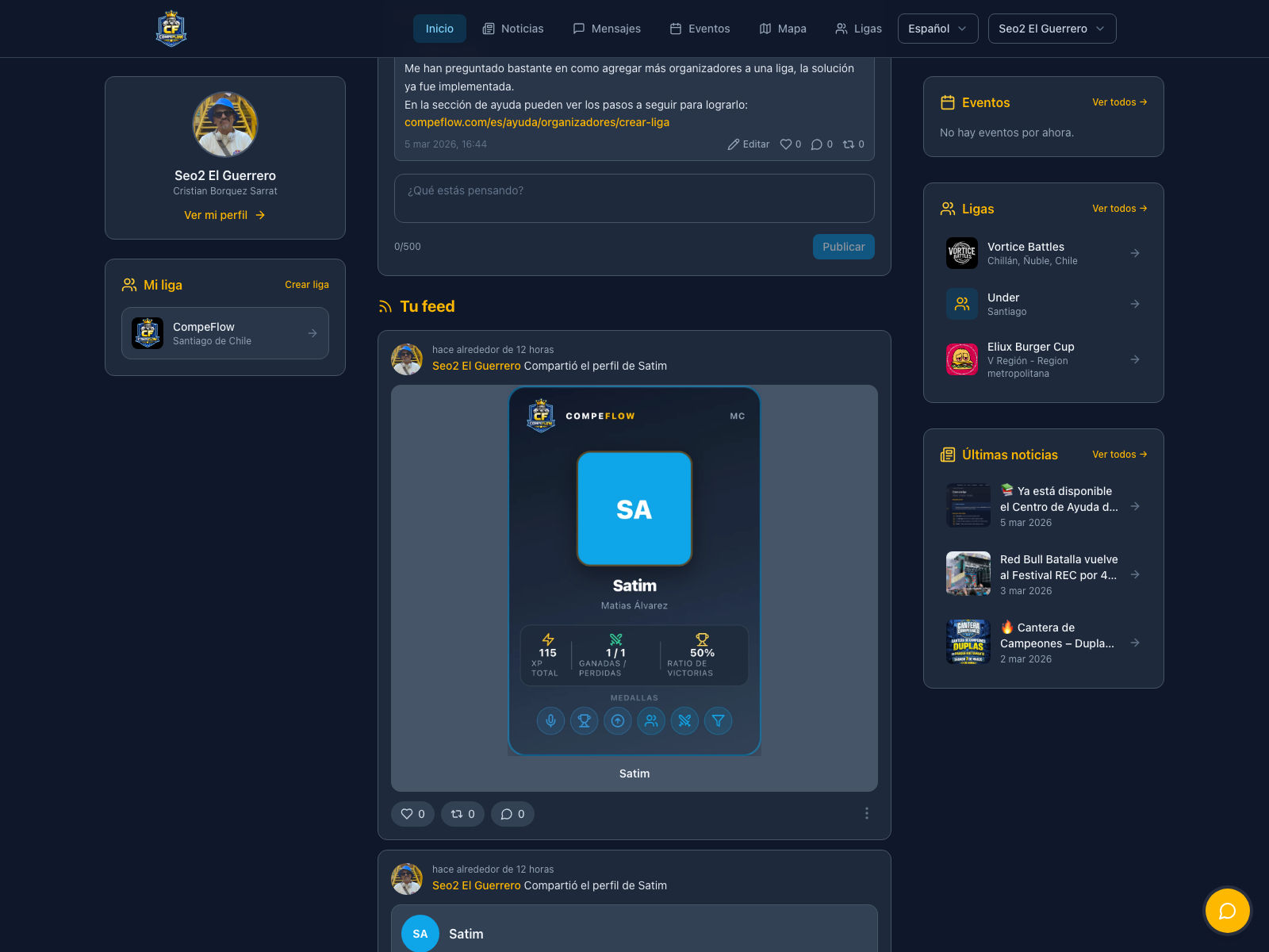 Vista principal de la web de CompeFlow con feed, noticias y paneles laterales