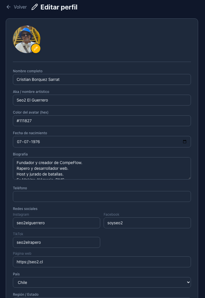 La carta es tu tarjeta de presentación digital. Incluye foto, nombre, bio, estadísticas y un QR para que otros te sigan. Créala en Mi perfil → Carta y compártela en redes.