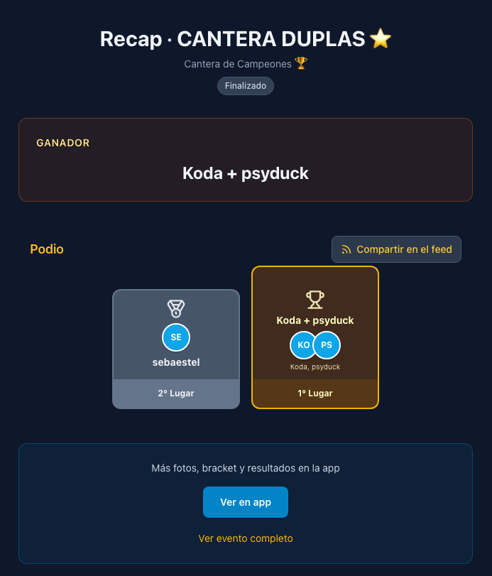 - Tarjeta de evento: Genera una imagen compartible con el podio y resultados